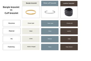 Teža razlika je između narukvica i manžeta, i metalnih manžeta i kožnih manžeta. Ukratko, narukvice su krute i forme potpunog kruga. Manžeti su otvoreni s jednog kraja, omogućujući vam da ih navučete na zapešće. Kožni manžeti, s druge strane, su široki komadi kože koji se omotavaju oko vašeg zapešća, nudeći ili dodatnu podršku ili robusni stil.