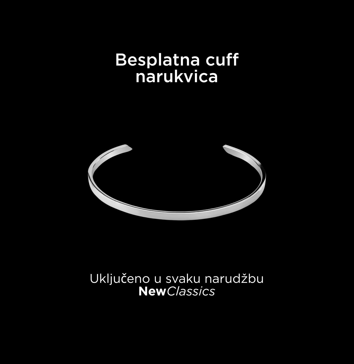 Odaberi bilo koji nakit iz kolekcije NewClassics na ovoj stranici i besplatna cuff narukvica bit će dodana automatski. Nema minimalne narudžbe, nema koda. Samo jednostavan komad od nehrđajućeg čelika na naš račun za proslavu nove kolekcije.